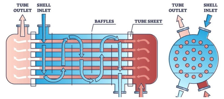 - 고온/저온 유체가 각각 셸과 튜브 쪽을 흐르며 열 교환