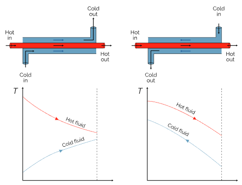 - 두 유체는 벽(튜브나 판) 하나를 사이에 두고 오직 ‘열’만 이동