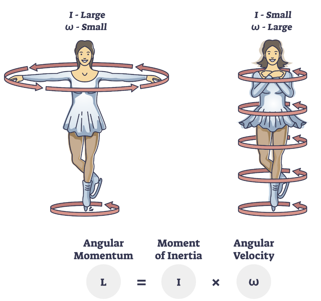 관성모멘트 I도 줄어들기 때문에 회전 속도(각속도)가 증가합니다.
